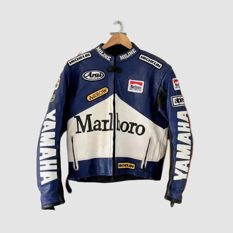 The Marlboro Racing Blue & White Motorcycle Leather Jacket exudes a classic yet contemporary racing style. Its sleek design, coupled with the iconic Marlboro branding, makes it a timeless piece that can be paired with any riding gear. The contrasting colors and sharp lines create a visually appealing look that stands out on and off the track.