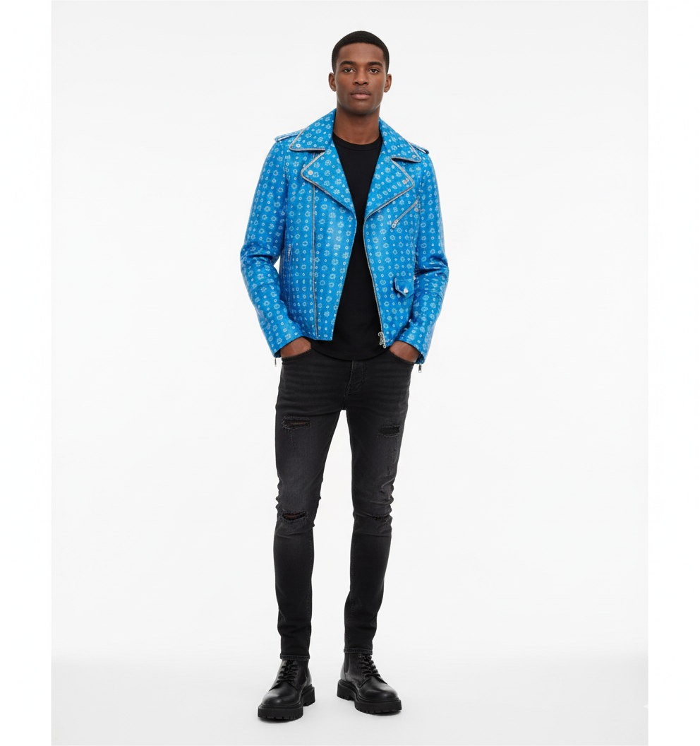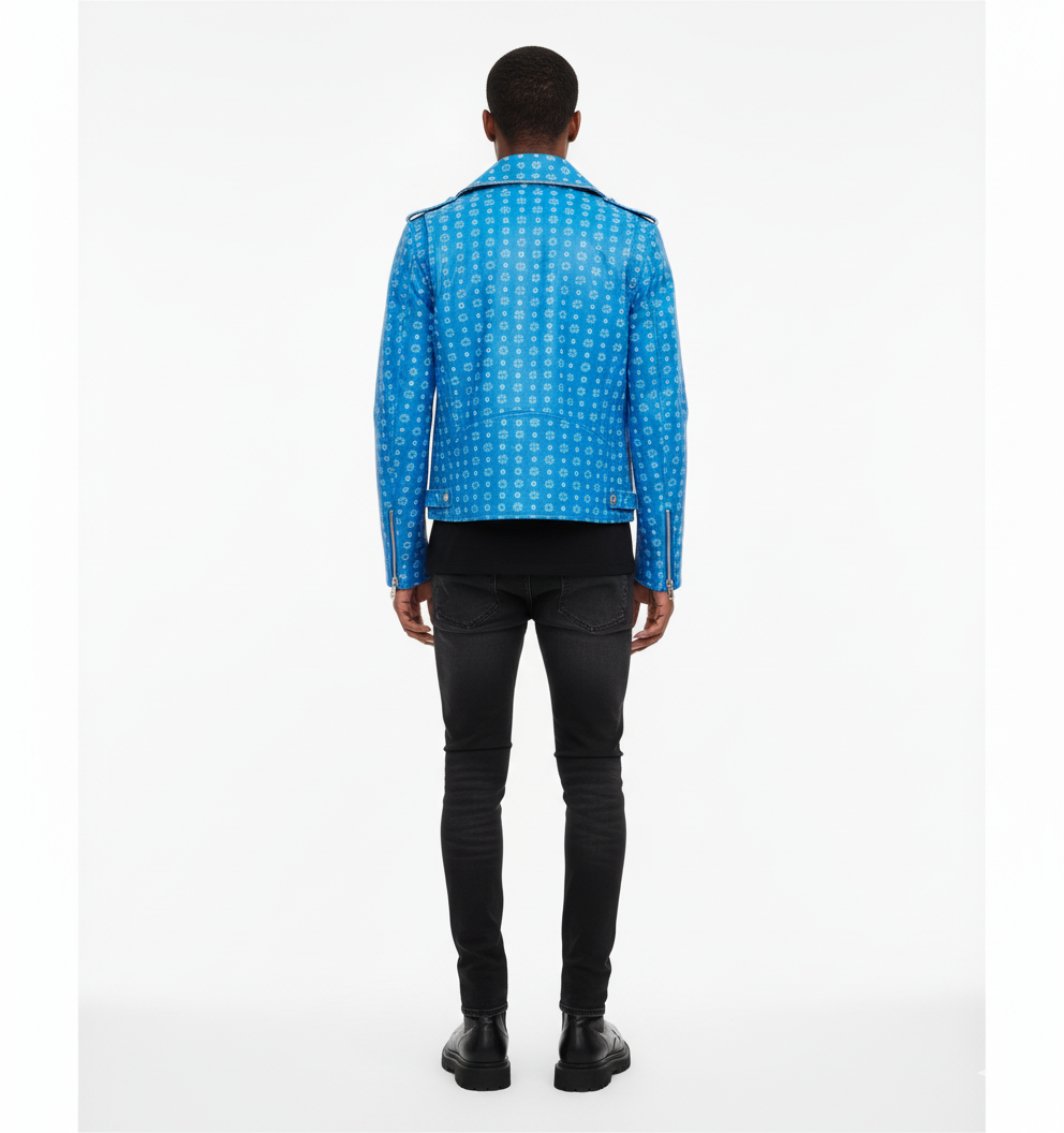 Elevate your wardrobe with the exclusive MCM Blue Leather Biker Jacket. This is a true statement piece that perfectly fuses classic motorcycle styling with modern luxury streetwear. The jacket offers an unforgettable look and exceptional quality. It is designed for the man who defines his own style.