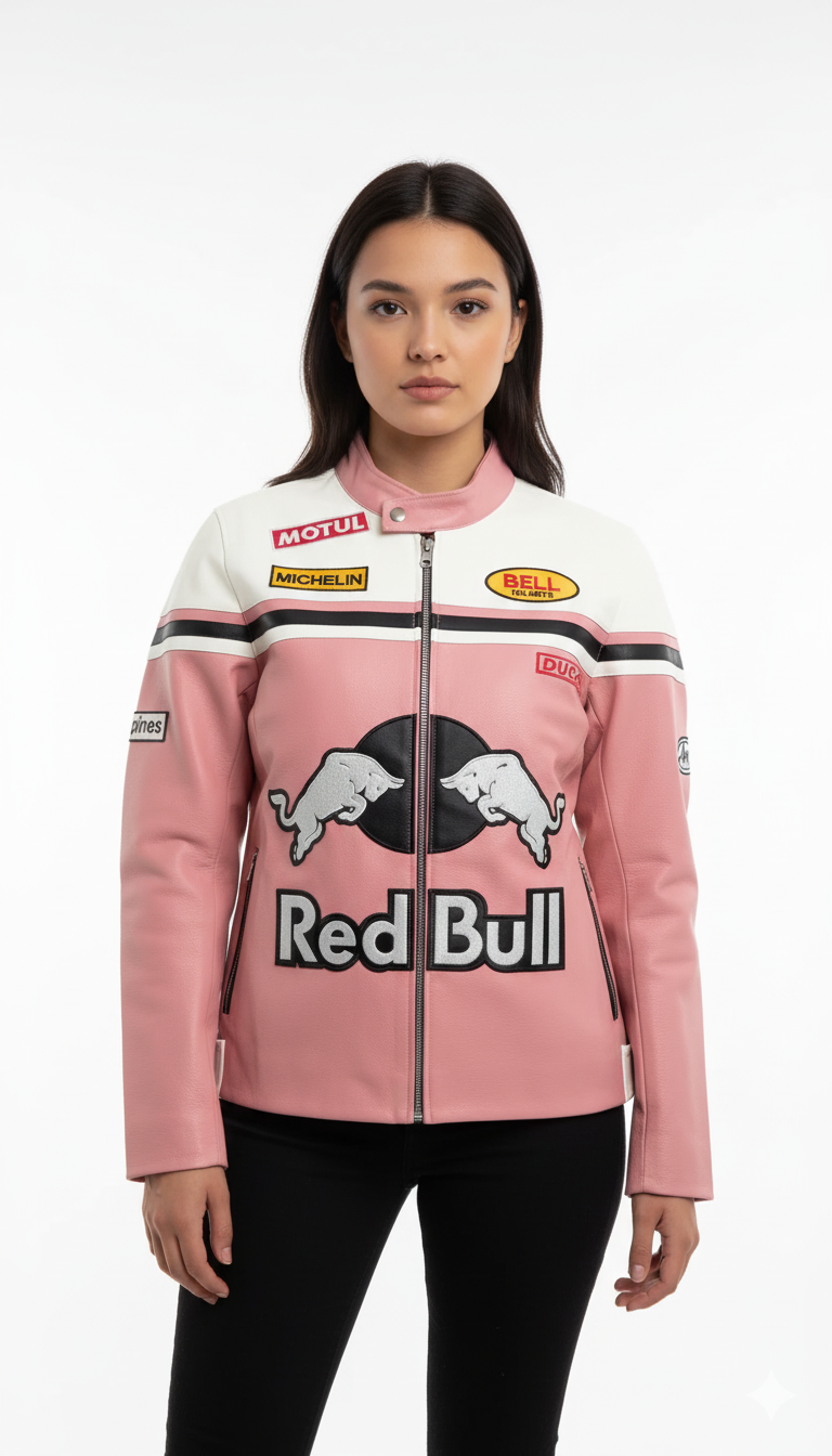 Step into motorsport history with this Red Bull Vintage Racing Leather Jacket, a true collector’s item from the 1990s. Crafted from genuine leather, this jacket features bold Red Bull branding and sponsor logos, capturing the essence of Formula One racing culture.