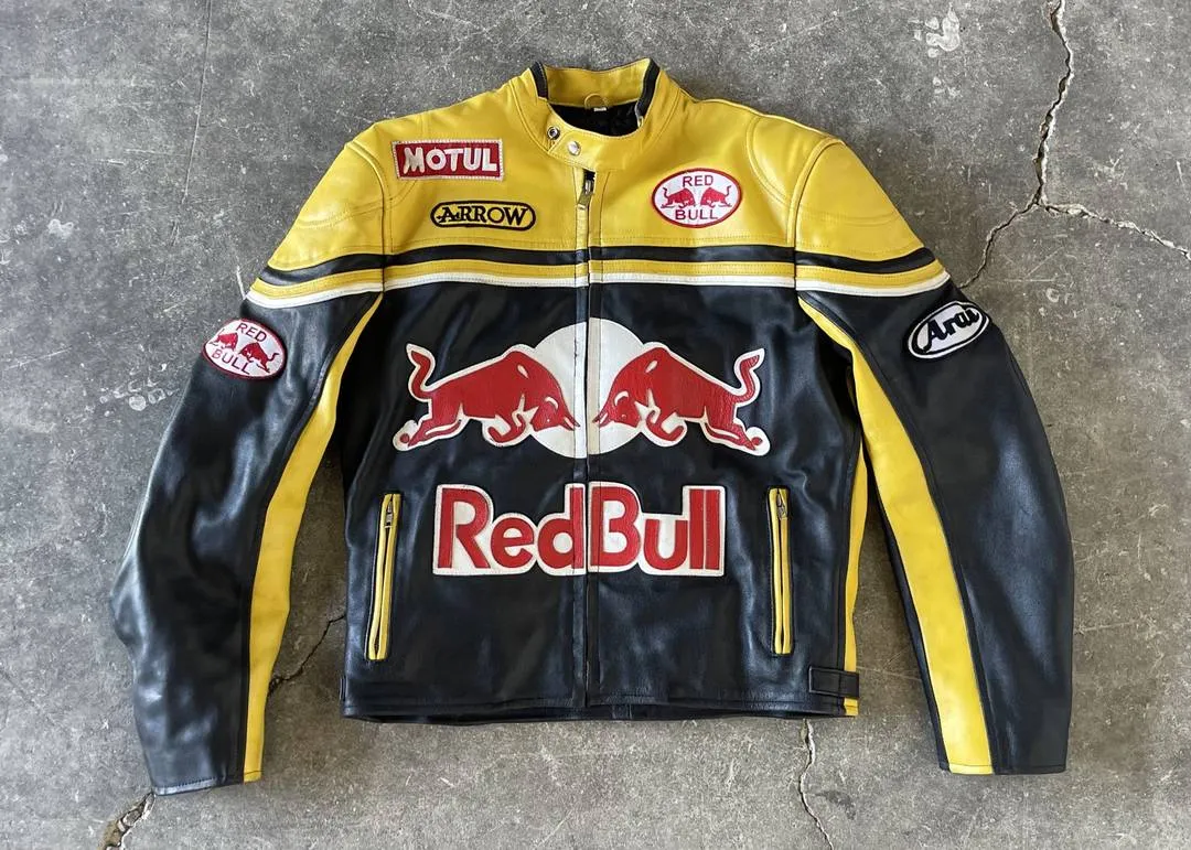 - Premium Leather: The Vintage Red Bull Racing Leather Jacket is made from genuine cowhide leather, known for its exceptional durability and resistance to abrasion. The leather is treated to ensure it remains supple and weather-resistant, making it ideal for all riding conditions.