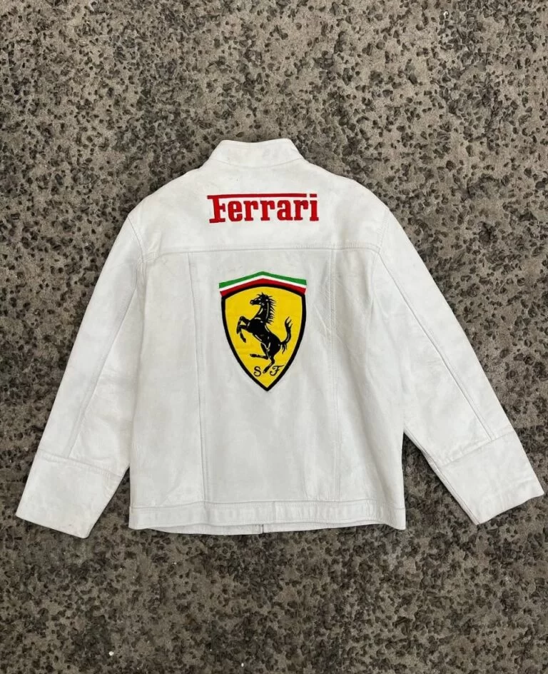 This White Ferrari Leather jacket is a stylish tribute to Ferrari’s dominant Formula 1 years in the early 2000s. While not an official licensed Ferrari product, it captures the spirit and nostalgia of the Michael Schumacher era, showcasing iconic sponsor logos that defined one of the greatest periods in F1 history. Whether you’re a passionate F1 fan, a collector of motorsport memorabilia, or simply looking for a unique statement piece, this jacket combines vintage appeal with premium materials and craftsmanship.