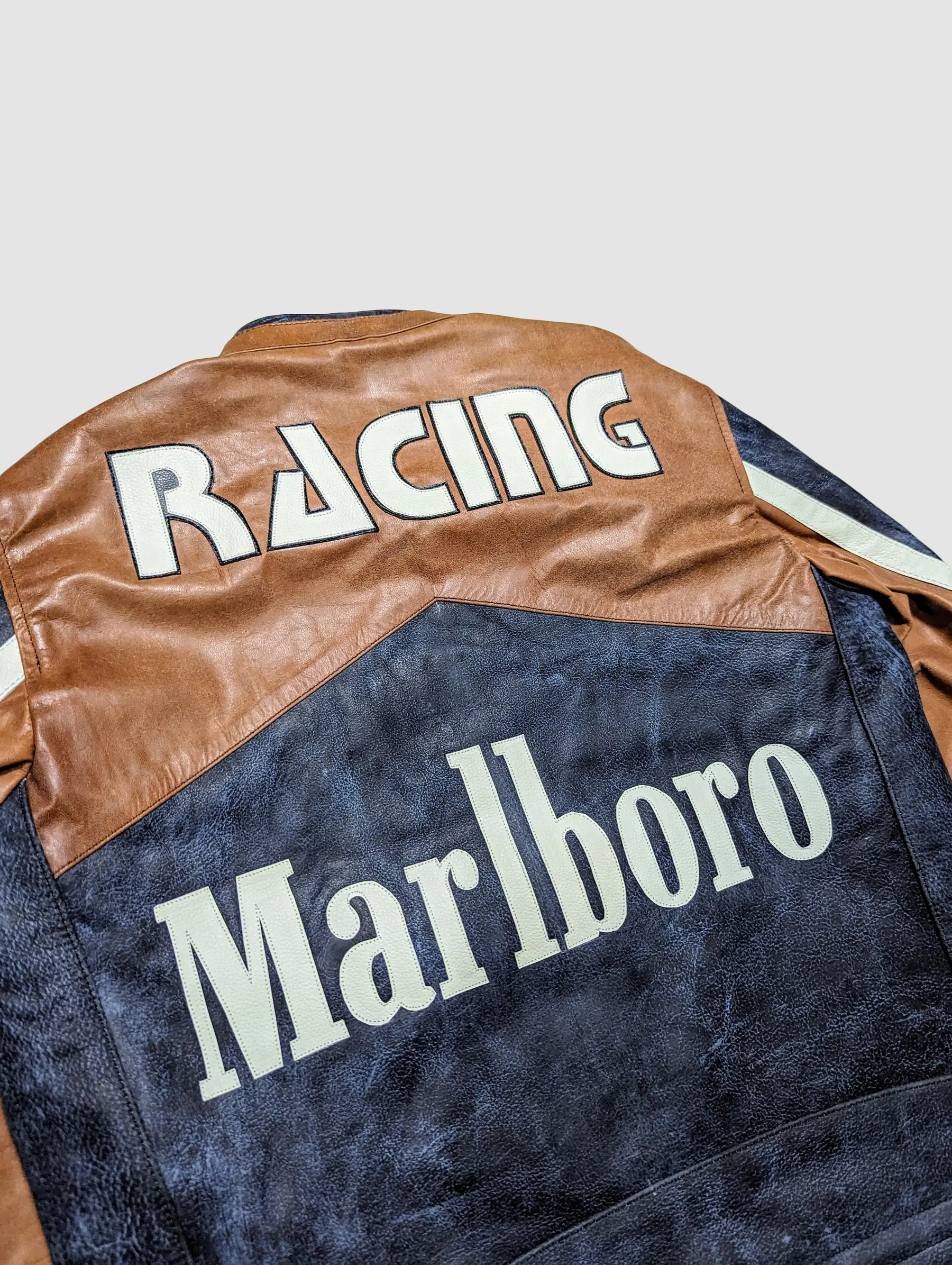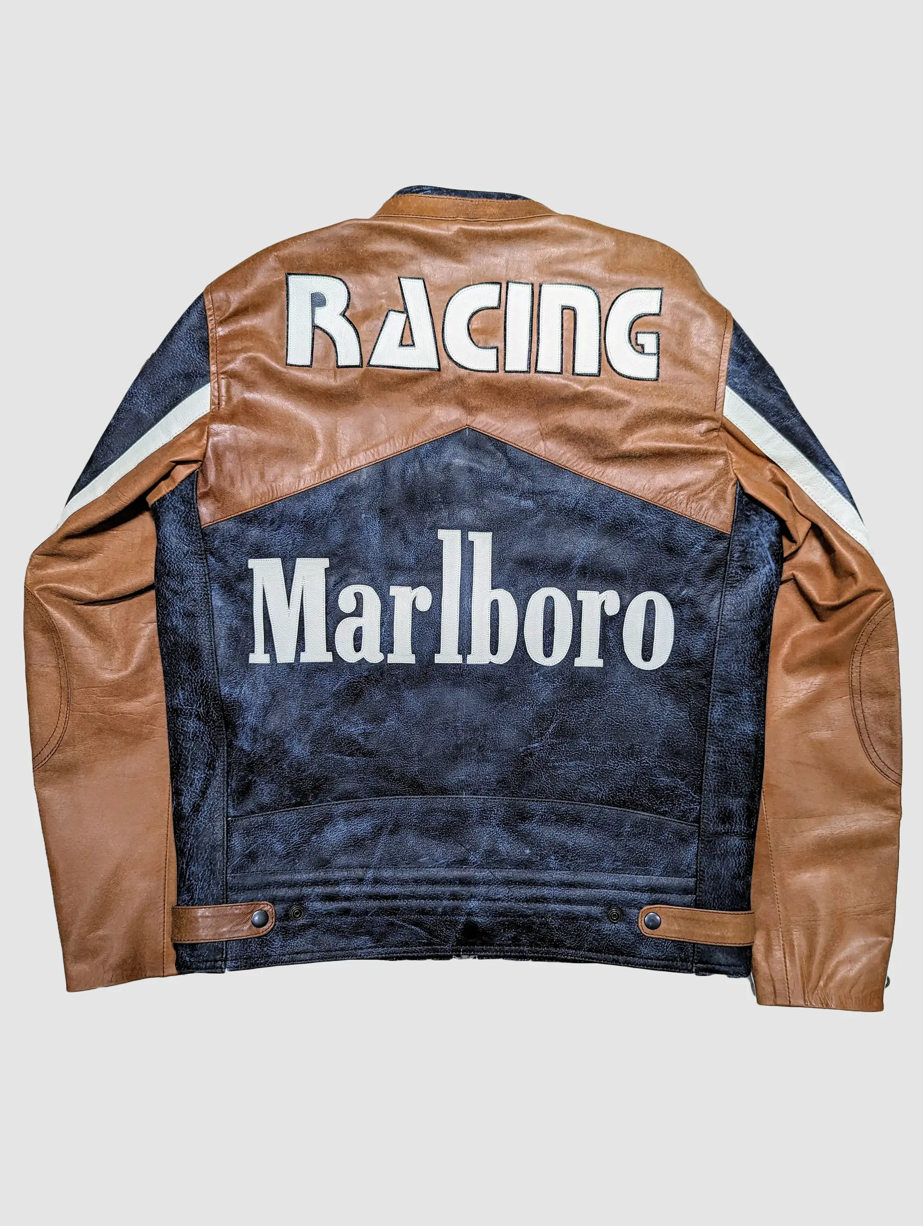 The jacket features the iconic Marlboro branding, with bold logos and racing stripes that pay homage to the brand’s rich history in motorsport. Its sleek design and classic black leather make it a timeless piece that pairs well with any riding gear.